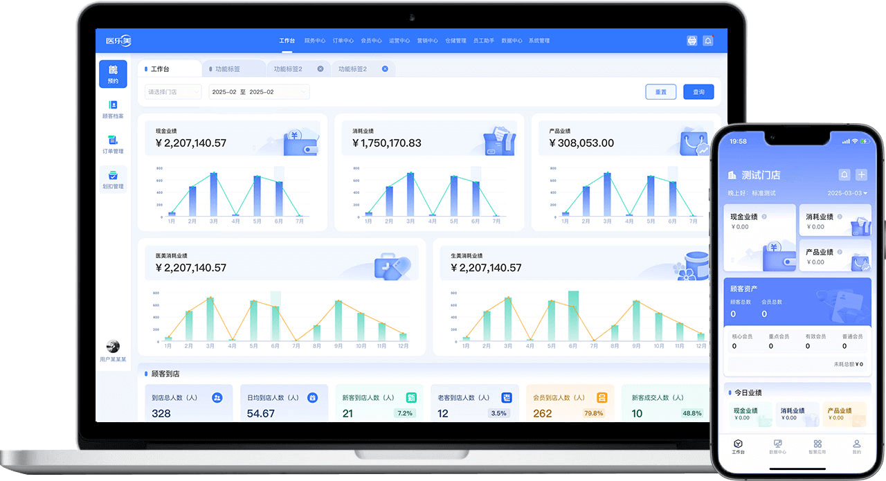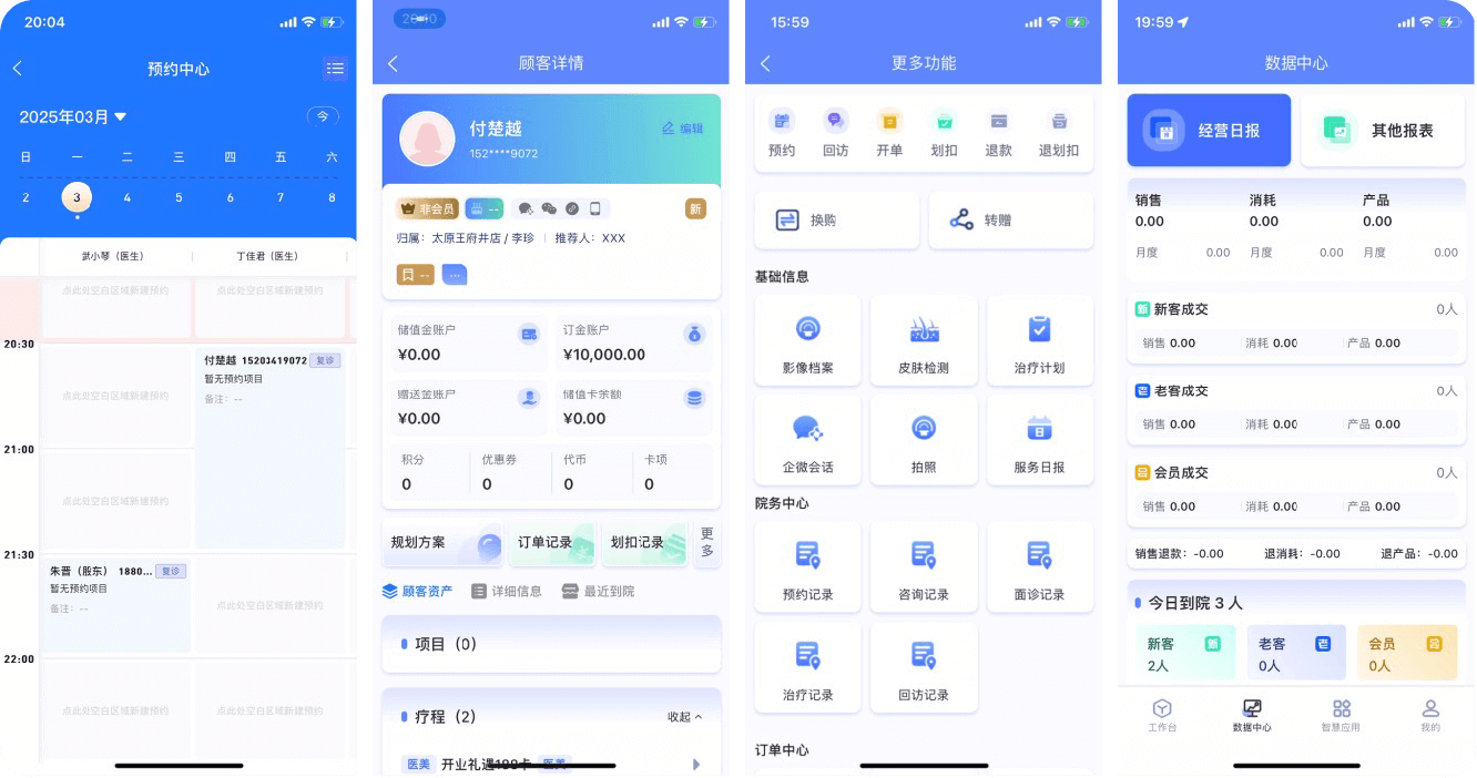 ◆ 集预约、建档、到院、咨询、开单、收银、分诊、面诊、配台出库、治疗/病历、离院回访、二次邀约为一体化的完成院务管理系统。系统各流程节点灵活可配,各类机构按需配置。