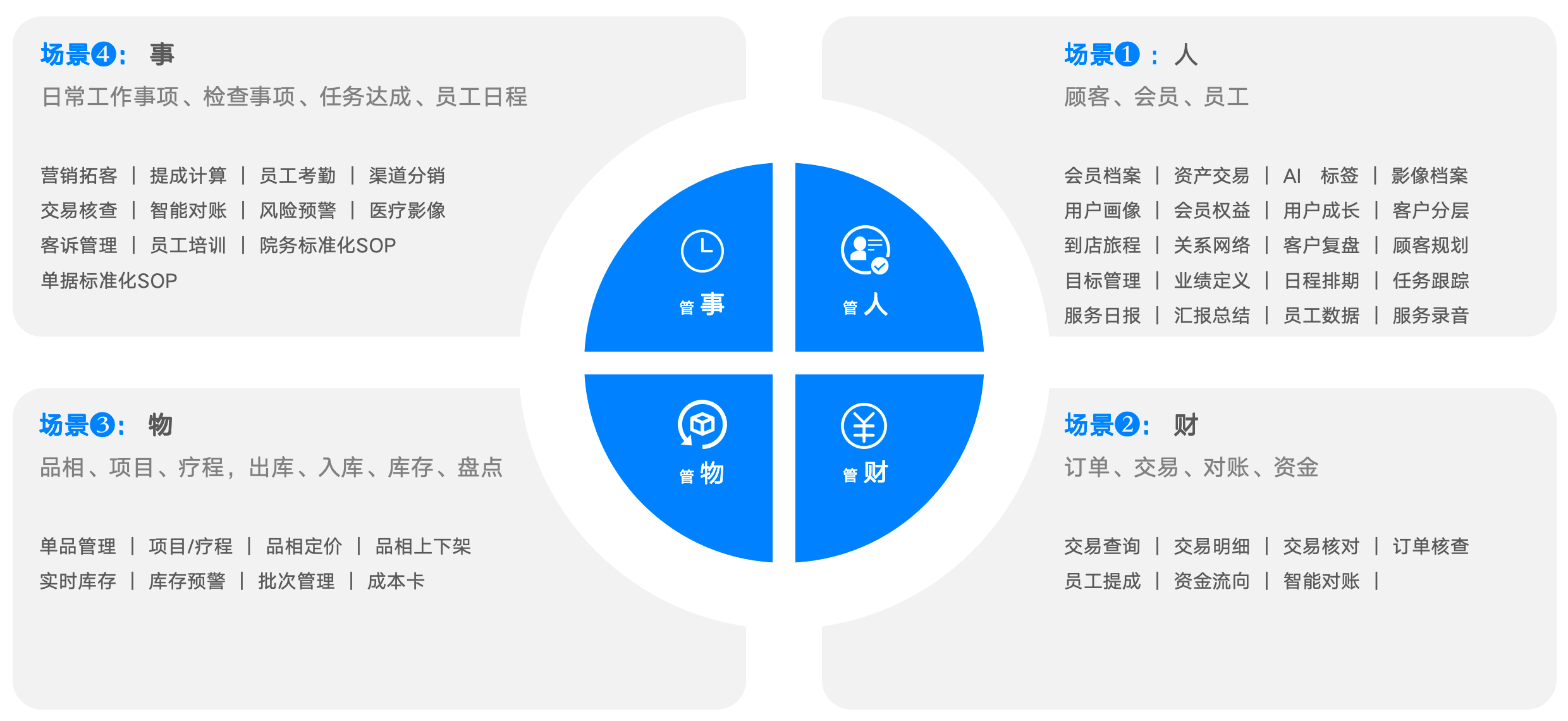 内嵌连锁运营管理“5力”模型。聚焦“人、财、物、事”四大核心场景。4大数智化管理工具包覆盖全业务场景。